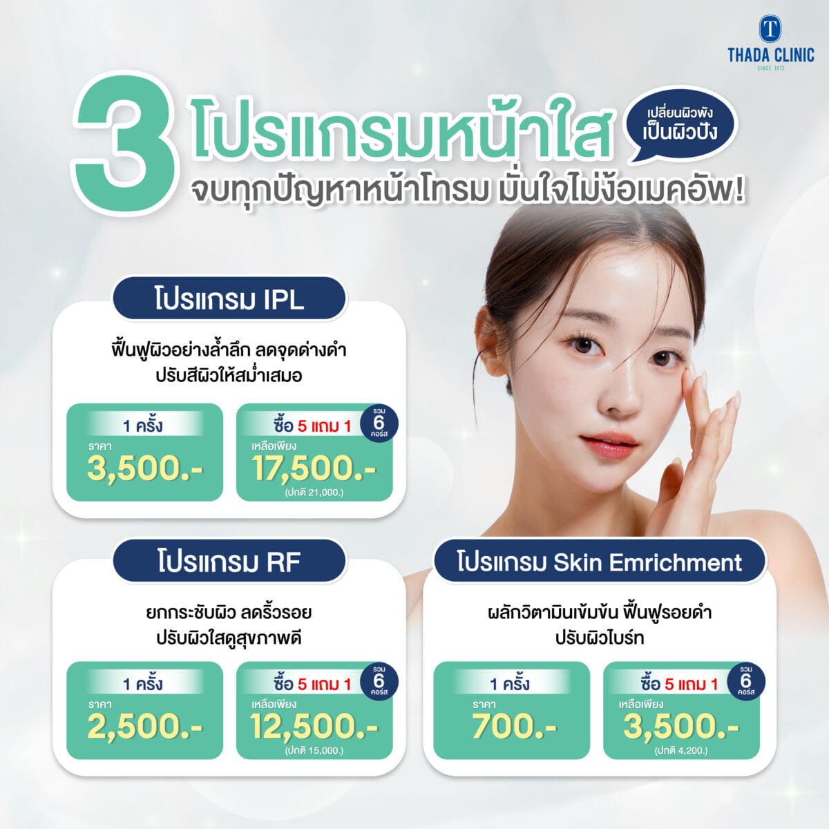 1 ครั้ง 3,500 บาท (ซื้อ 5 แถม 1) รวม 6 คอร์ส เหลือเพียง 17,500.- ปกติ 21,000.-